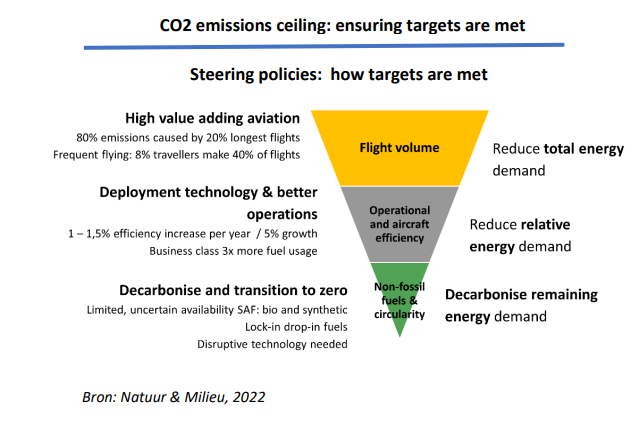 Om binnen de grenzen te blijven van wat de biosfeer nog kan opnemen aan broeikasgassen moet uitstoot van de luchtvaart afnemen. En dat begint met slim krimpen: op basis van data minder-men anders vliegen zodanig dat de Nederlander er zo weinig mogelijk nadeel van ondervindt. De helft van de uitstoot wordt veroorzaakt door slechts 5% van de vluchten (lange afstand). Veertig procent van het verkeer bestaat uit veelvliegers (8% van totaal aantal unieke passagiers). En een groot deel van de passagiers die op Schiphol vertrekken en aankomen, stapten over op een andere vlucht van- of naar de eindbestemming.